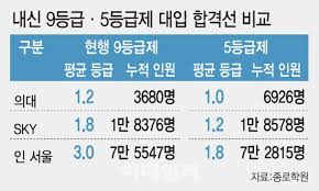 κΈ°μ‘΄μ 9λ±κΈμ λ νμμ λ§€μ° μΈλ°νκ² μμ΄ννλ ꡬ쑰μλ€. μμ 4%κ° 1λ±κΈ, μ΄ν 7%, 12%, 17% λ±μΌλ‘ λ±κΈμ΄ λλλ©΄μ νμλ€ μ¬μ΄μ μ μ μ°¨μ΄λ₯Ό λ§€μ° μ λ°νκ² κ΅¬λΆνλ€. μ΄λ¬ν 체κ³λ λν μ μμμ λ³λ³λ ₯μ ν보νλ λ°λ μ 리νμ§λ§, ννΈμΌλ‘λ κ³Όλν μ±μ κ²½μκ³Ό μν μ€μ¬ κ΅μ‘μ μ λνλ€λ λΉνμ λ°μμλ€.