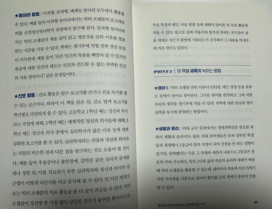 μ΄ μ± μ μλ μ μλ₯Ό μ€λΉνλ νμλ€μ μν μ§μΉ¨μλ‘, μκΈ°λΆμ μΈνΉκ³Ό 창체μ λ μλ₯Ό μ°½μμ μΌλ‘ λ Ήμ΄λ λ°©λ²μ λ΄κ³ μλ€. μΈλ¬Έ, μ¬ν, κΈ°μ΄ μκ³Όν, μμ¬λΌλ μ§μ , λ―Έλμ μν λ± λ€μ― κ°μ§ ν€μλμ λ°λΌ νλ μ 50κΆμ μκ°νλ©°, κ°κ°μ μ± μ μ΄λ»κ² μκΈ°λΆμ νμ©ν μ μλμ§ μμ΄λμ΄λ₯Ό μ 곡νλ€. κ³ κ΅ κ³Όμ μμ μ£Όμν μ€λΉκ³Όμ μΈ μ°½μ²΄μ 3λ νλμΈ μμ¨ νλ, λμ리 νλ, μ§λ‘ νλμ μ΄λ»κ² λ ΉμΌ μ μλμ§ μμ΄λμ΄λ₯Ό μ 곡νλ κ²μ΄λ€. μ μκ° μ νν μμ λ€μ μλ κ΅μλ€μ΄ μκΈ°λΆλ₯Ό 보며 κΆκΈμ¦μ λλ λ§ν μ± , μ± μ λμ΄λμ μ λͺ μΈκ° μλλΌ, λ΄κ° μλμ μ ν©ν μΈμ¬μμ μΌλ§λ μ 보μ¬μ£Όλκ°λ₯Ό κΈ°μ€μΌλ‘ νκ³ , μλͺ κ³Όνμ μΉμ°μΉ λ μκ° μλ μ€λλ κ³ μ λΆν° μ΅μ νΈλ λκΉμ§ νλκ² λ€λ£¨λλ‘ νλ€κ³ νλ€.
