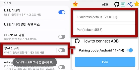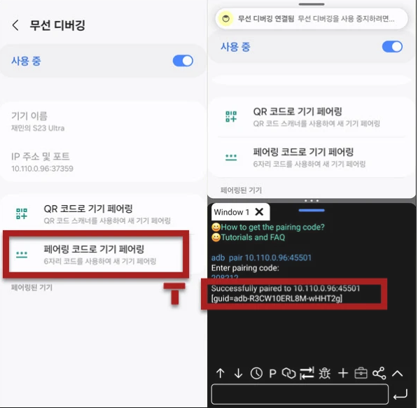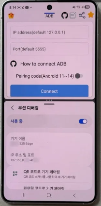 ๋ฌด์ ๋๋ฒ๊น ํ๋ฉด์ ํ์๋ IP์ฃผ์์ ํฌํธ ๋ฒํธ๋ฅผ ADB ์ฑ์ ์ ๋ ฅ → Pair ๋ฒํผ ํด๋ฆญ.